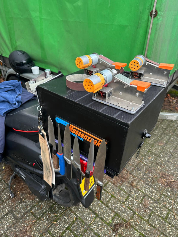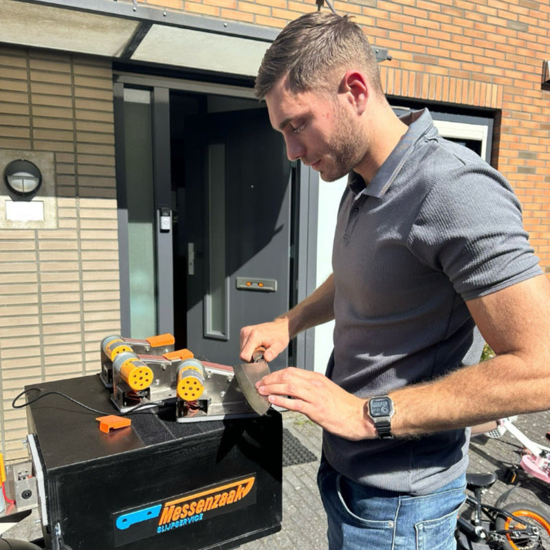 Met mijn mobiele werkplaats kom ik naar u toe. Geen ritjes naar de stad, geen messen die u dagenlang moet missen. Ik parkeer mijn mobiele werkplaats op locatie en slijp uw messen terwijl u wacht.